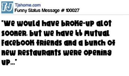 X "We would have broke-up alot sooner, but we have 46 mutual Facebook friends and a bunch of new restaurants were opening up..."