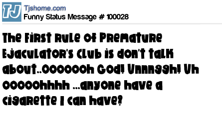 X is The First rule of Premature Ejaculator's Club is don't talk about..Ooooooh God! Unnnggh! Uh ooooohhhh ...anyone have a cigarette I can have?