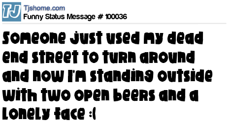 X is Someone just used my dead end street to turn around and now I'm standing outside with two open beers and a lonely face :(