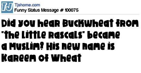 - # 157834 Buckwheat (of Little Rascals fame) has converted to Islam and changed his name to Kareem of Wheat.