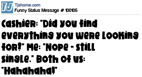 X Cashier: "Did you find everything you were looking for?" Me: "Nope - still single." Both of us: "Hahahaha!"