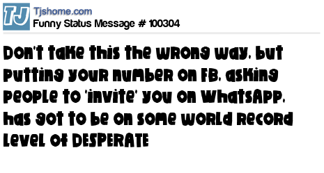 X Don't take this the wrong way, but putting your number on FB, asking people to 'invite' you on WhatsApp, has got to be on some world record level of DESPERATE