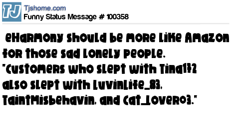 X eHarmony should be more like Amazon for those sad lonely people. "Customers who slept with Tina172 also slept with LuvinLife_83, TaintMisbehavin, and Cat_Lover03."