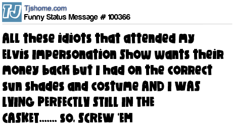 X All these idiots that attended my Elvis Impersonation Show wants their money back but I had on the correct sun shades and costume AND I WAS LYING PERFECTLY STILL IN THE CASKET....... so, SCREW 'EM