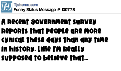 X A recent government survey reports that people are more cynical these days than any time in history. Like I'm really supposed to believe that…