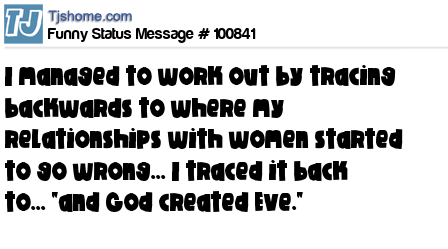 X  I managed to work out by tracing backwards to where my relationships with women started to go wrong... I traced it back to... "and God created Eve."