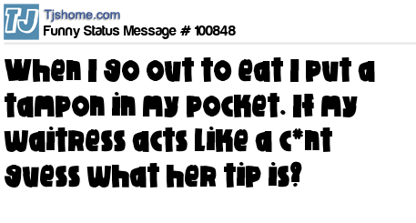 X When I go out to eat I put a tampon in my pocket. If my waitress acts like a c*nt guess what her tip is?