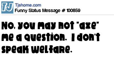 - # 102749 No, you may not "axe" me a question. I don't speak welfare.