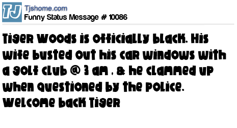 X says Tiger Woods is officially black. His wife busted out his car windows with a golf club @ 3 am , & he clammed up when questioned by the police. Welcome back Tiger