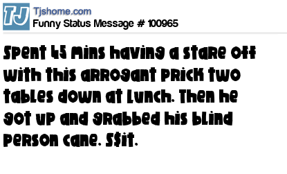 X is Spent 45 mins having a stare off with this arrogant prick two tables down at Lunch. Then he got up and grabbed his blind person cane. S$it.