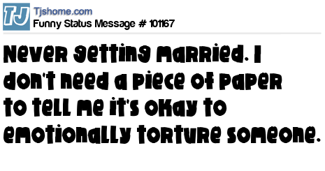 X says Never getting married. I don't need a piece of paper to tell me it's okay to emotionally torture someone.