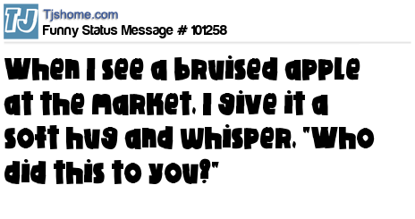 - # 133012 Whenever I see a bruised apple at the market, I give it a soft hug and gently whisper "Who did this to you?"
