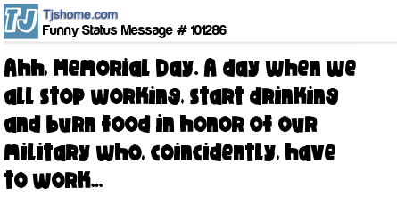 X says Ahh, Memorial Day. A day when we all stop working, start drinking and burn food in honor of our military who, coincidently, have to work…