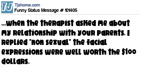 - # 101399 when the therapist asks about your relationship with your parents, just say "non sexual" that will answer them and keep them quiet for $100 an hour!! Well worth the facial expressions.