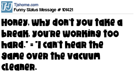 X is Honey, why don't you take a break, you're working too hard." = "I can't hear the game over the vacuum cleaner.