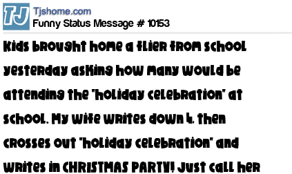 X Kids brought home a flier from school yesterday asking how many would be attending the "holiday celebration" at school. My wife writes down 4, then crosses out "holiday celebration" and writes in CHRISTMAS PARTY! Just call her old school!