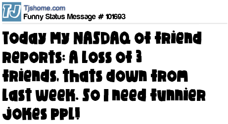 X Today My NASDAQ of friend reports: A loss of 3 friends, thats down from last week. So I need funnier jokes ppl!