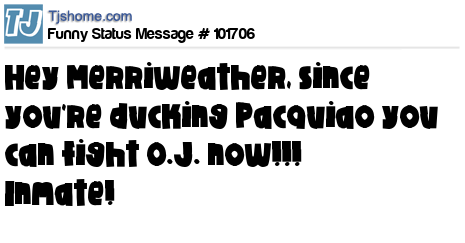 X is Hey Merriweather, since you're ducking Pacquiao you can fight O.J. now!!! Inmate!