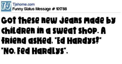 X Got these new jeans made by children in a sweat shop. A friend asked, "Ed Hardys?" "No, Fed Hardlys".