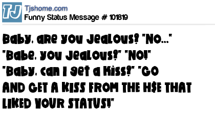 X is Baby, are you Jealous? "No..." "Babe, you Jealous?" "NO!" "Baby, can I get a kiss?" "GO AND GET A KISS FROM THE H$E THAT LIKED YOUR STATUS!"