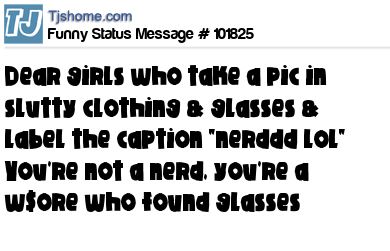 - # 77251 It's annoying when girls take pictures in glasses and they're like "I'm a nerd". Like shut up you're not a nerd you're just a slut with glasses on.