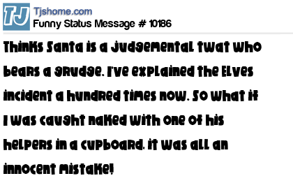 X thinks Santa is a judgemental twat who bears a grudge. I've explained the Elves incident a hundred times now. So what if I was caught naked with one of his helpers in a cupboard, it was all an innocent mistake!