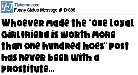 X Whoever made the ''One loyal Girlfriend is worth more than one hundred hoes'' post has never been with a prostitute...