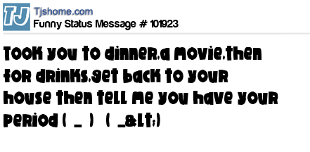 - # 82381 took you to dinner,a movie,then for drinks,get back to your house then tell me you have your period (・_・)ノ”(ノ_<)
