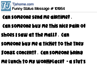X “Can someone send me airtime?”, “Can someone buy me this nice pair of shoes I saw at the mall?”, “Can someone buy me a ticket to the Trey Songz concert?”, “Can someone bring me lunch to my workplace?” - a s1ut's facebook st@tus upd@tes.