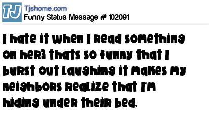 X I hate it when I read something on her3 thats so funny that I burst out laughing it makes my neighbors realize that I'm hiding under their bed.