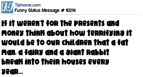 X if it weren't for the presents and money think about how terrifying it would be to our children that a fat man, a fairy and a giant rabbit break into their houses every year...