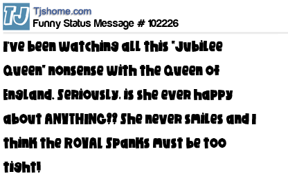 X is I've been watching all this "Jubilee Queen" nonsense with the Queen of England. Seriously, is she ever happy about ANYTHING?? She never smiles and I think the ROYAL Spanks must be too tight!