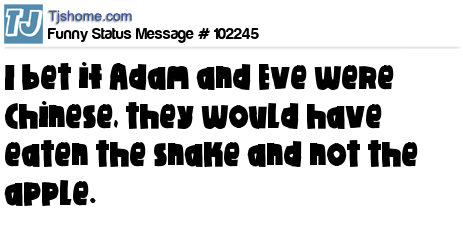 - # 14368 thinks if adam and eve were chinese they would have eaten the snake instead of the apple!