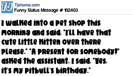X I walked into a pet shop this morning and said, "I'll have that cute little kitten over there please." "A present for somebody?" asked the assistant. I said, "Yes, it's my pitbull's birthday."