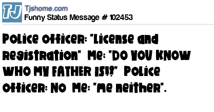 X is Police officer: "license and registration" Me: "DO YOU KNOW WHO MY FATHER IS!?" Police officer: No Me: "me neither".