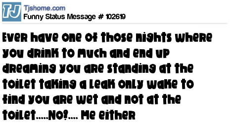 X Ever have one of those nights where you drink to much and end up dreaming you are standing at the toilet taking a leak only wake to find you are wet and not at the toilet.....No?.... Me either