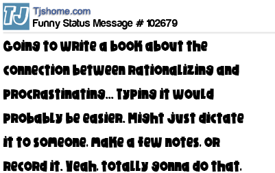 X is going to write a book about the connection between rationalizing and procrastinating... Typing it would probably be easier. Might just dictate it to someone, make a few notes, or record it. Yeah, totally gonna do that, eventually!