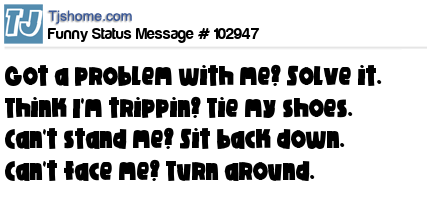 - # 51488 Got a problem with me?? Solve it. Think I'm trippin'?? Tie my shoes. Can't stand me?? Sit back down. Can't face me?? Turn the hell around.