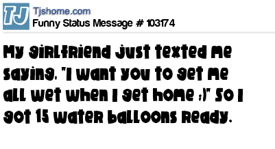 X is My girlfriend just texted me saying, "I want you to get me all wet when I get home ;)" So I got 15 water balloons ready.