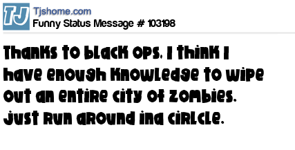 X is Thanks to black ops, I think I have enough knowledge to wipe out an entire city of zombies. just run around ina cirlcle.