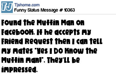 X Found the Muffin Man on Facebook. If he accepts my Friend Request then I can tell my mates "Yes I DO know the Muffin man!". They'll be impressed.
