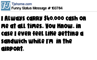 - # 80012 Always carry $100,000 cash on you at all times in case you ever feel like getting a sandwich from an airport.