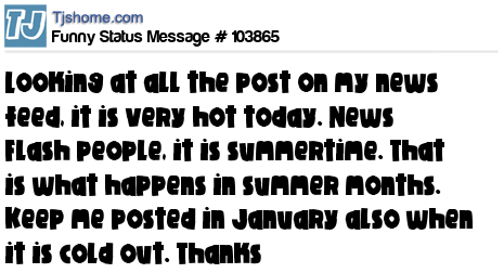 X Looking at all the post on my news feed, it is very hot today. News Flash people, it is summertime. That is what happens in summer months. Keep me posted in January also when it is cold out. Thanks