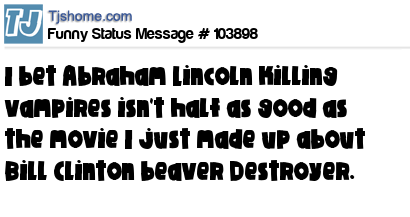 - # 104592 The new film Abraham Lincoln: Vampire Hunter looks quite good. I think I'll wait for the sequel, Bill Clinton: Lady Killer.