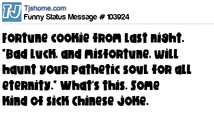 X says Fortune cookie from last night. "Bad luck, and misfortune, will haunt your pathetic soul for all eternity." What's this. Some kind of sick Chinese joke.