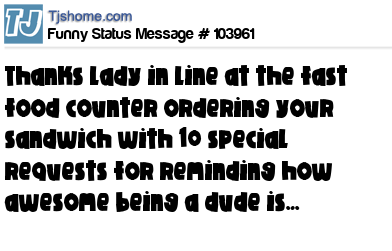 X says Thanks lady in line at the fast food counter ordering your sandwich with 10 special requests for reminding how awesome being a dude is…