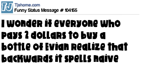 X I wonder if everyone who pays 2 dollars to buy a bottle of Evian realize that backwards it spells naive