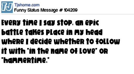X Every time I say stop, an epic battle takes place in my head where I decide whether to follow it with "in the name of love" or "hammertime."