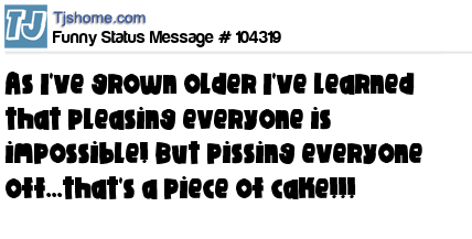 - # 67678 I have learned that pleasing everyone is too hard, but pissing everyone off is a piece of cake and I like it :-)