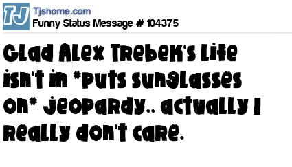 X is glad Alex Trebek's life isn't in *puts sunglasses on* jeopardy.. actually I really don't care.